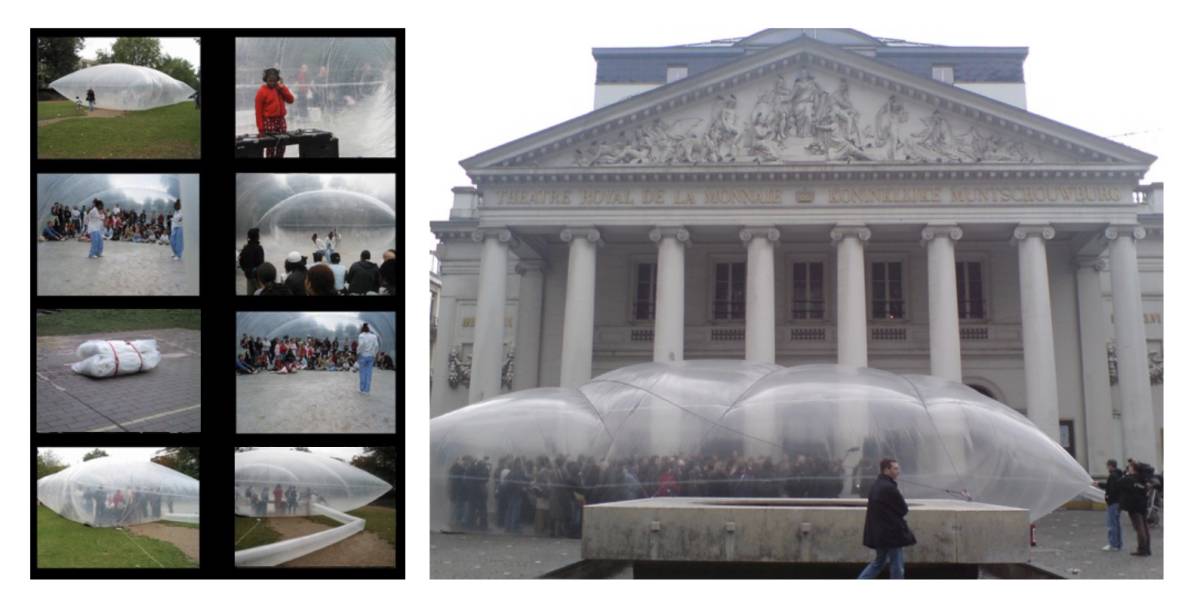 Transparent plastic bell tents, #inflated by a small compressor, which can be used to quickly #occupy an area, draw attention to it, meet, share, show, debate, ... https://www.alterechos.be/city-mined-extension-du-domaine-des-tools/