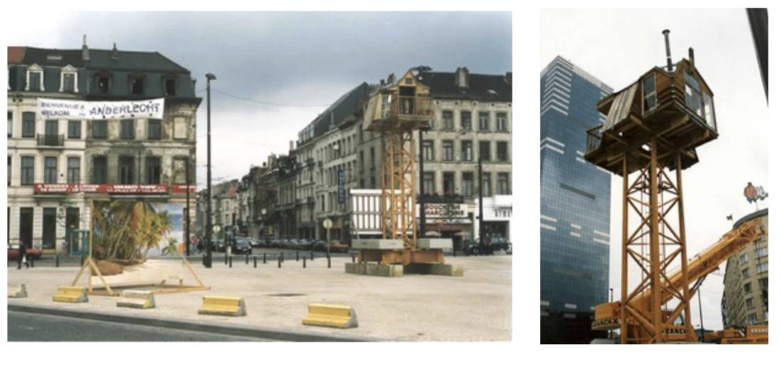 In August 2000, theater maker and visual artist Benjamin Verdonck lived for 10 days in a hut he built himself atop a 10m-high tower crane at Place Bara in Anderlecht. While there, he himself,local residents and visitors to the Midi market held breakfasts, concerts, performances etc. Every morning he also published a letter at the front page of different national newspapers, and received letters back from enchanted readers. The aim ? The give a human face to a public space and a part of Brussels that was not on the radar at the time. In the run up, other activities had already prepare the ground. In April a banner was put up on the place Bara reading « Welcome to Anderlecht. » This seemingly innocent message resonated with an entry gate above the shopping street rue Wayez that also read « Welcome to Anderlecht » , but that incidently excluded Kureghem, poorest part of Anderlecht. The banner was contentious enough for an emergency meeting of Anderlecht’s municipal council in which they allowed it to stay up.